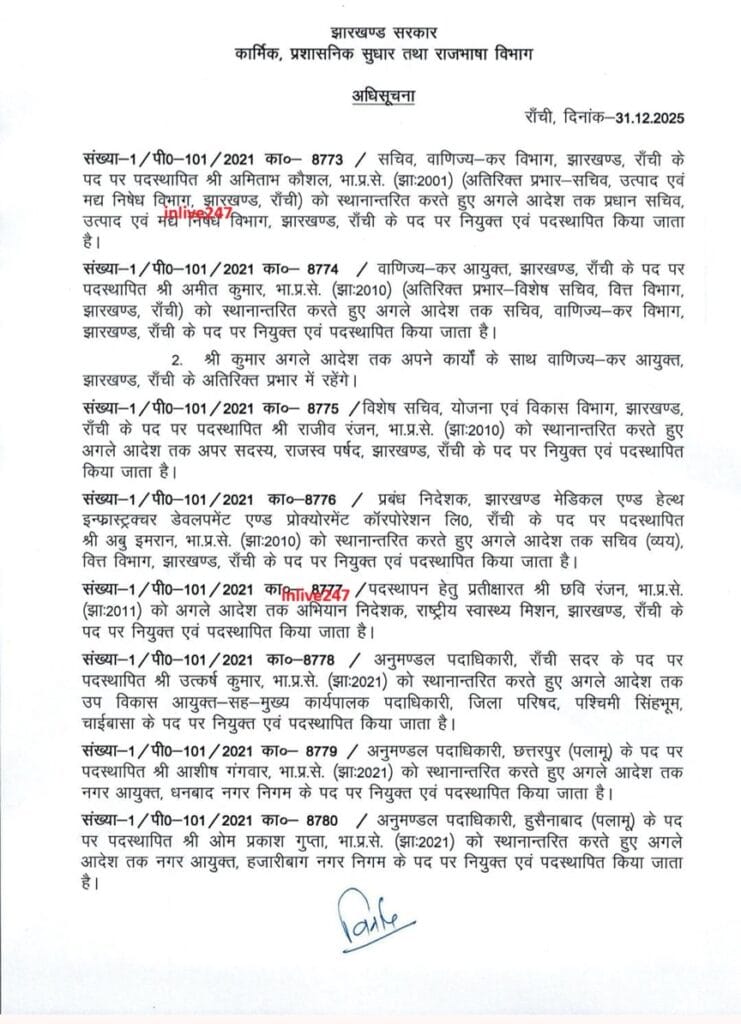 inlive247 Desk: नए साल से पहले झारखंड प्रशासन में बड़ा प्रशासनिक फेरबदल देखने को मिला है. राज्य सरकार ने कई भारतीय प्रशासनिक सेवा (IAS) अधिकारियों का तबादला कर दिया है. इस कड़ी में पदस्थापन की प्रतीक्षा कर रहे आईएएस अधिकारी छवि रंजन को बड़ी जिम्मेदारी सौंपी गई है.