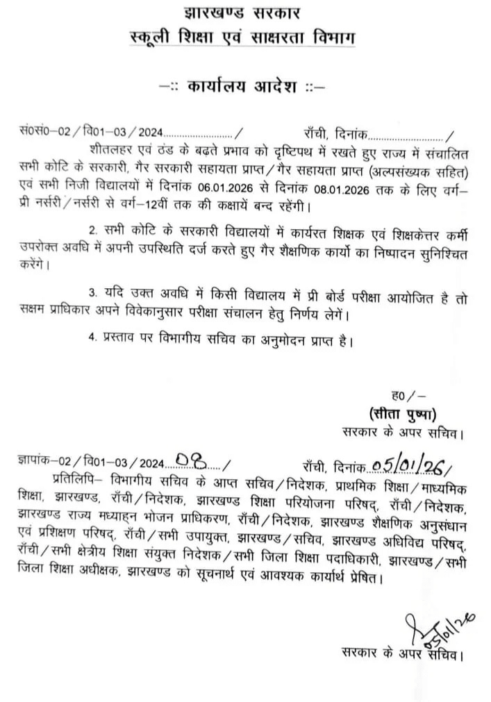 School Closed: शीतलहरी के कारण झारखंड के सभी प्राइवेट और सरकारी स्कूल 8 जनवरी तक बंद कर दिए गए हैं. स्कूल शिक्षा और साक्षरता विभाग ने इस संबंध में एक नोटिस जारी किया है. गौरतलब है कि झारखंड के सभी जिलों में कड़ाके की ठंड पड़ रही है. बच्चों को कड़ाके की ठंड से होने वाली दिक्कतों से बचाने के लिए स्कूलों को बंद करने का आदेश दिया गया है. इस दौरान प्री-नर्सरी और नर्सरी से लेकर क्लास 12 तक के स्टूडेंट्स के लिए कोई क्लास नहीं लगेगी.